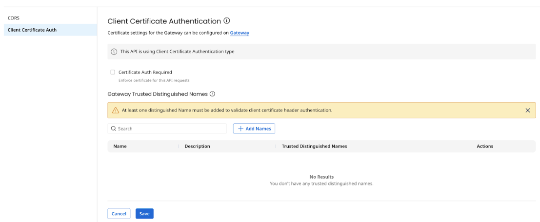 The deployed API inherits the authentication settings that are configured at the Gateway. These settings can be overridden for each API by selecting Add API Client Certificate Auth button.
