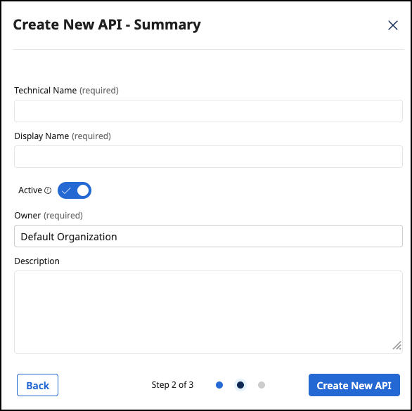 In API Control Plane, create an API at APIs > Actions > Create New API.