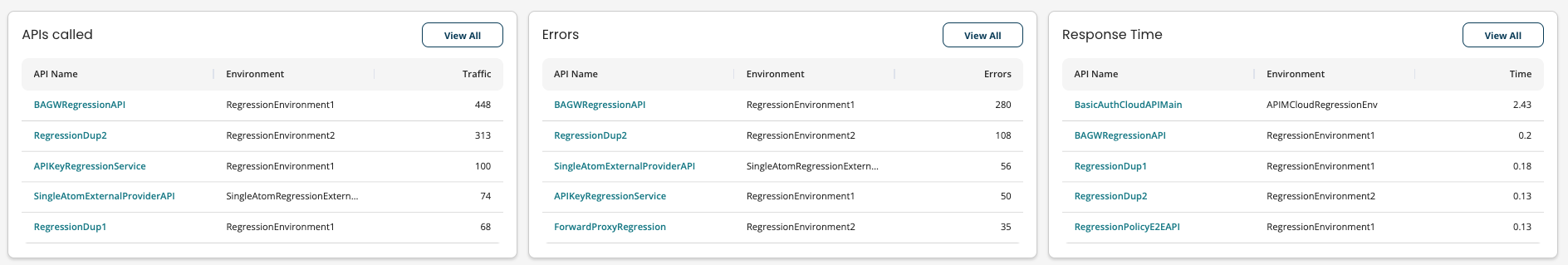 The table displays five APIs with the highest amount of errors. You can also view all APIs and the statistics for each.