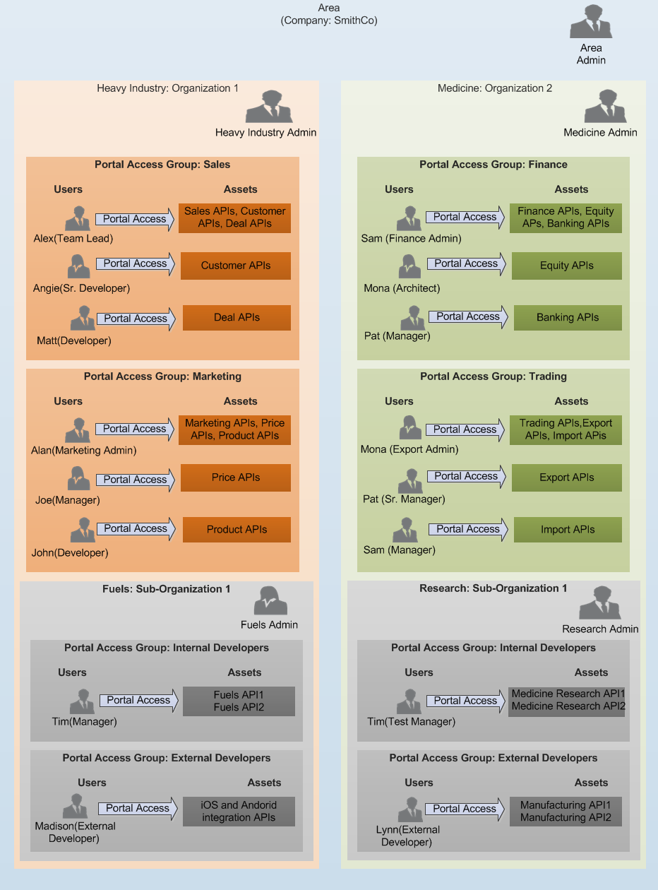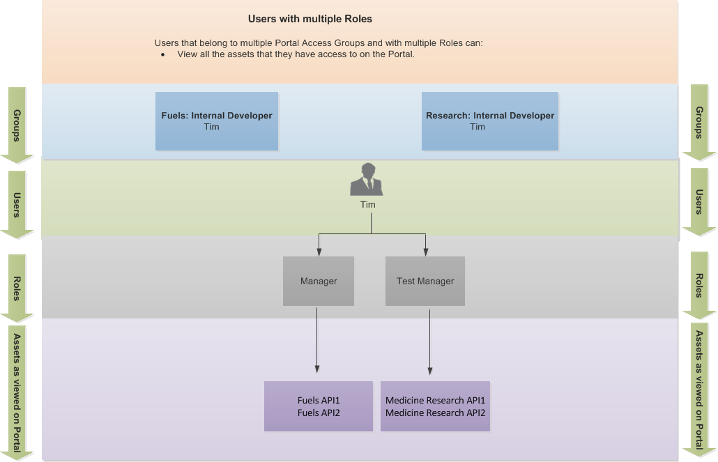 In the above Portal Access Group diagram, Tim belongs to two Portal Access Groups of two different sub-organizations: Internal Developer in Fuels and Internal Developer in Medicine Research.
