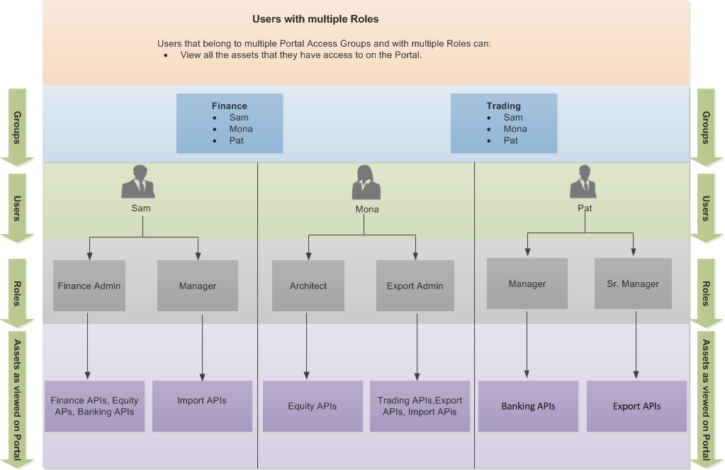 Users may belong to multiple Portal Access Groups in the same Organization. They can then view the APIs (on the Developer Portal) in the multiple Portal Access Groups.
