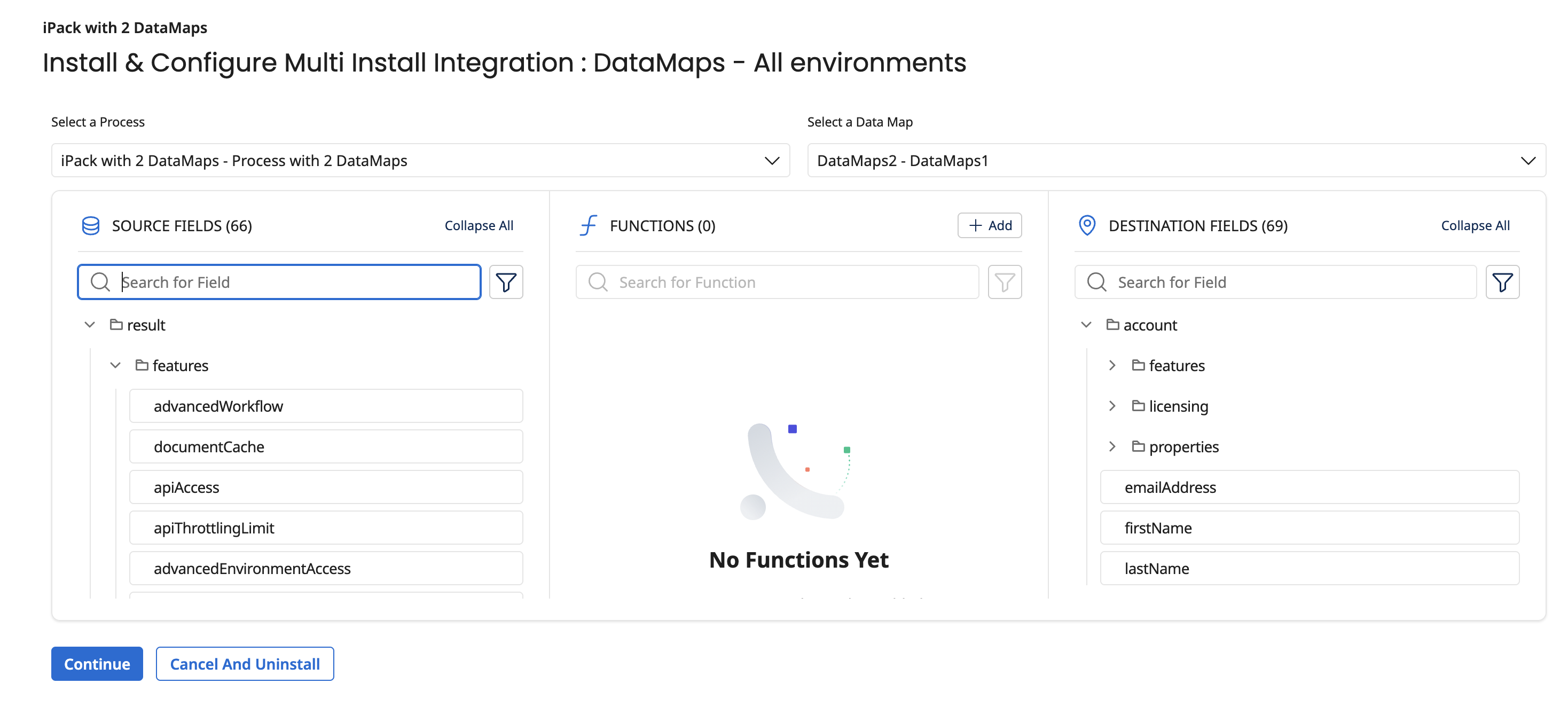 Data maps allow you to map additional fields for integration. While the admin preconfigures this during process creation, you can update or modify the mapping configuration as per your requirements. The Data maps page displays the SOURCE FIELDS, FUNCTIONS, and DESTINATION FIELDS.