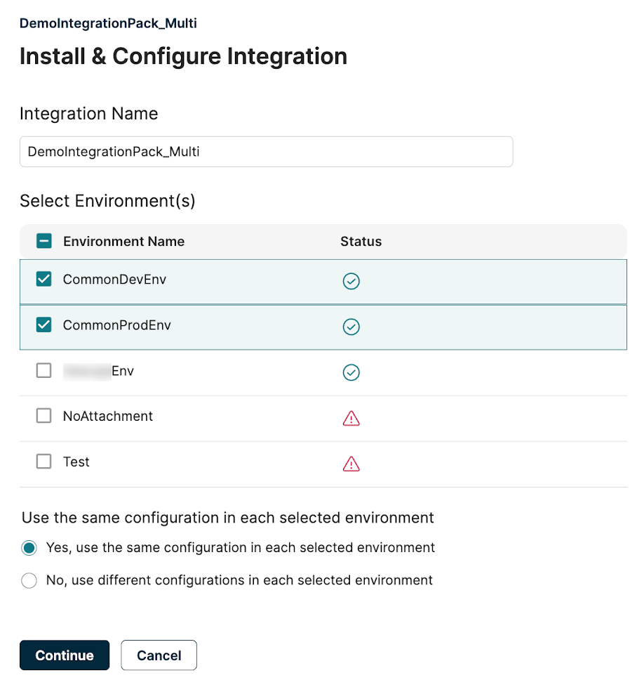 - Select one or multiple environments from the Select Environment(s) section, then click Continue. Environments are different spaces managed by the Space Admin within the Boomi Platform, shared here. Space users install integrations into these environments to schedule and run them. To learn more, refer to environment management. Checkboxes are disabled for unattached runtimes for specific environments, preventing you from selecting them.