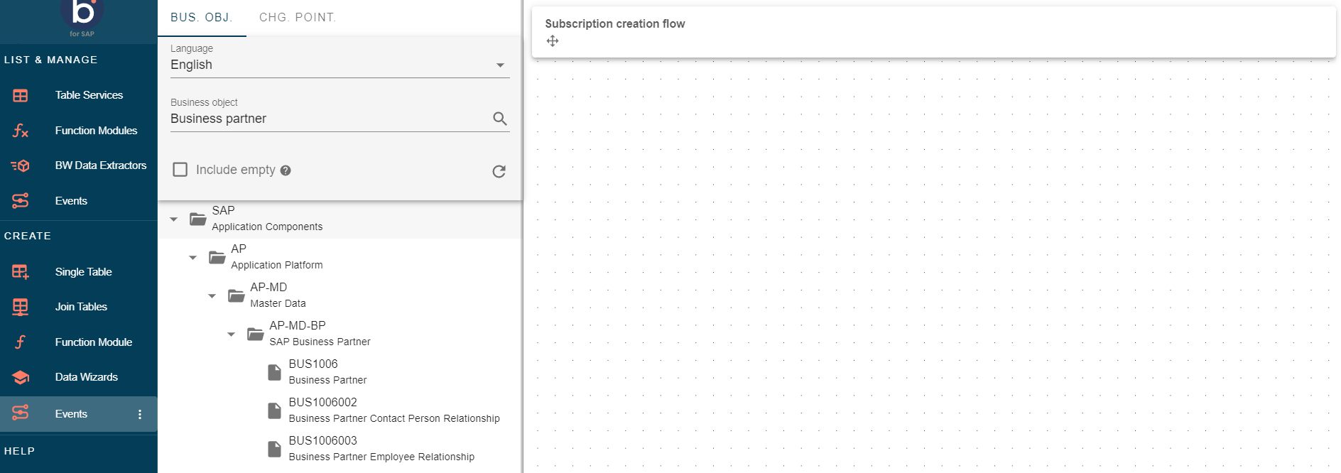 After choosing the Business Object you want to subscribe to an event, you can drag it onto the canvas or double-click it. This will show you the different types of events you can subscribe to.