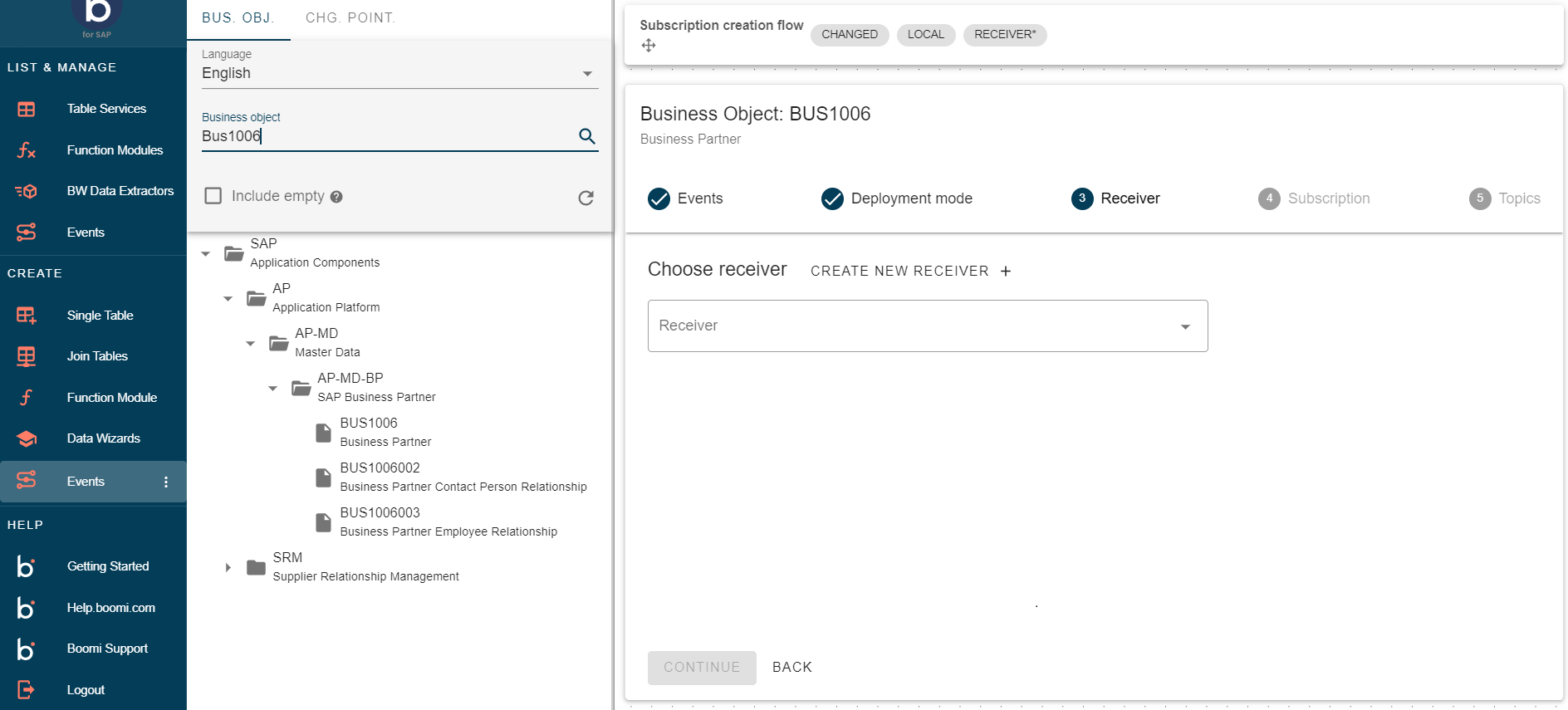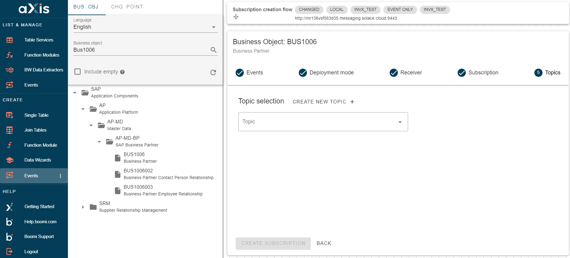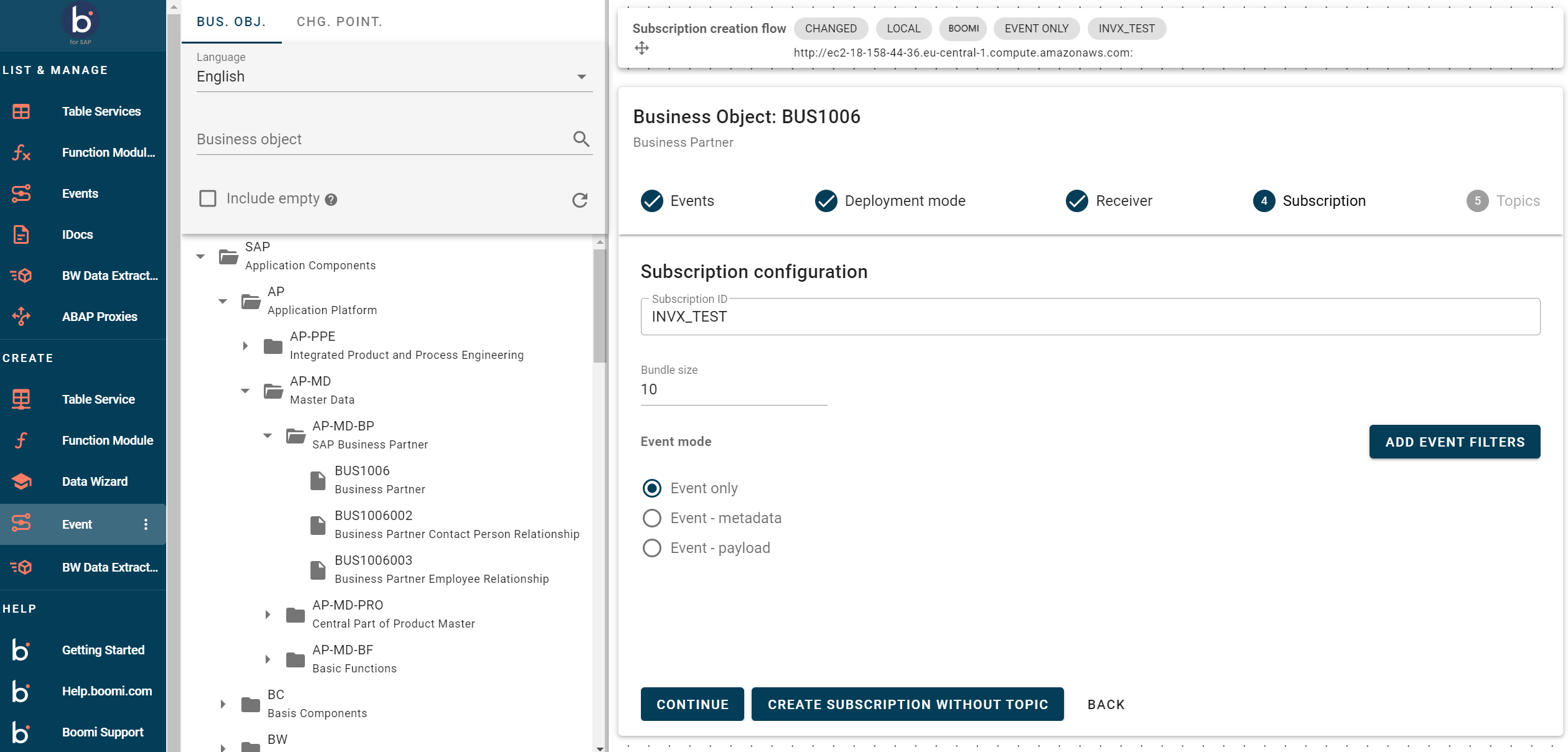 Adding Event Filters: You can add event filters that uses metadata from the event itself to determine if the event should be handled. These filters can examine the table key(s) in change pointer events or the fields from a business object event. Learn more about how Boomi for SAP manages Buisness Object Event and Payload Filtering.