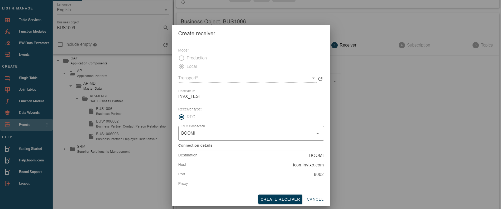 When creating a new receiver, you will need to provide the following information: Receiver ID: Choose an ID of your preference. Receiver Type: Select the connection type (RFC only). RFC Connection: Choose from the available SAP connections list.