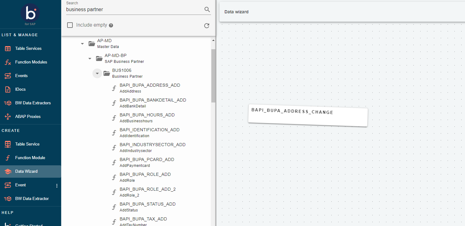 Data Wizards are based on SAP's integrated and managed BAPIs (Business API). Each BAPI consists of function modules focused on specific business domains or objects, enabling tasks such as retrieving the address of a particular business partner. Data Wizards provides SAP users with complete functionality through a user-friendly, interactive list on our platform.