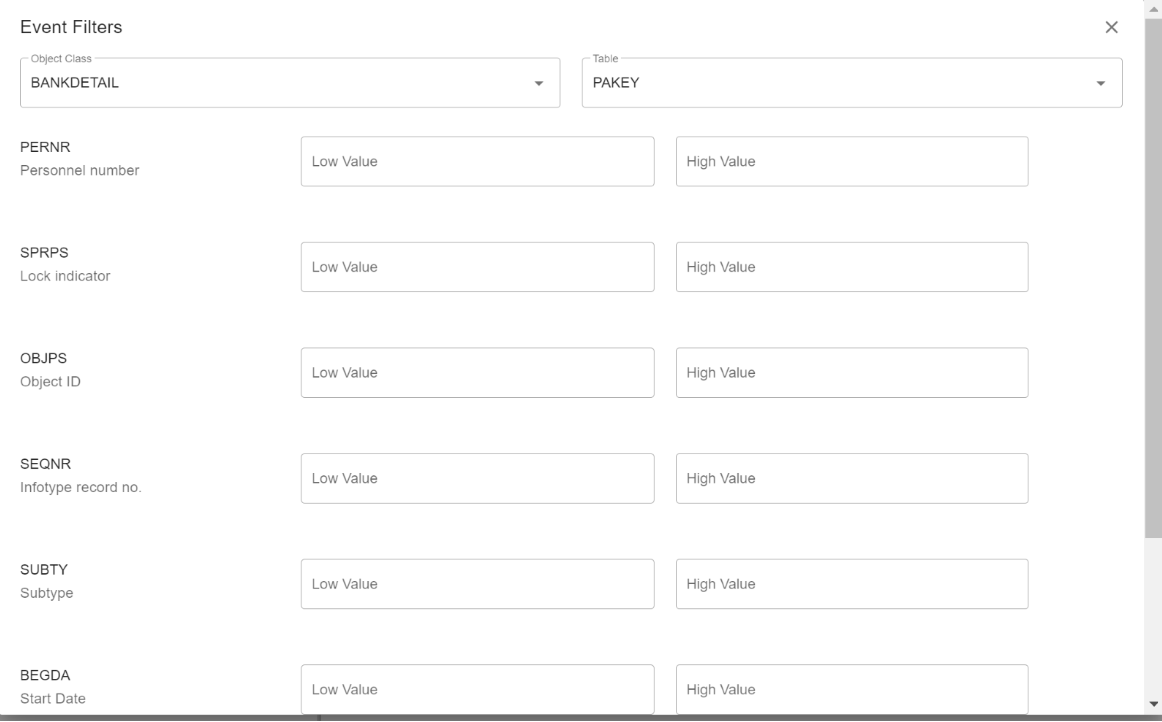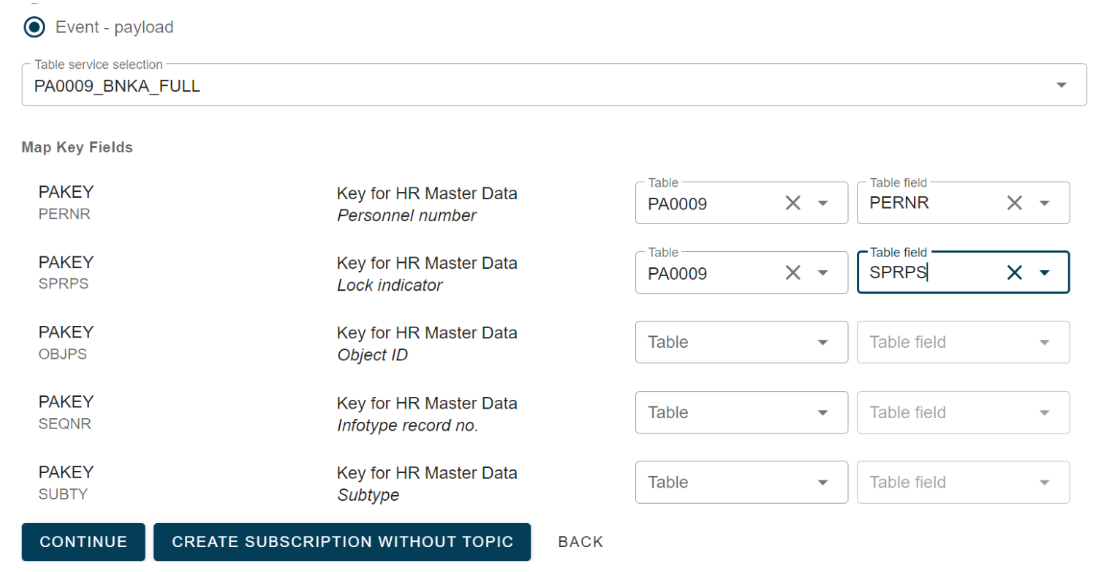 By selecting the payload option, you can view the key mapping and link the event data to input for payload extraction. At least one mapping is required to limit the extract. However, not all mappings may be necessary depending on the key definition of the business object and the table service table keys (The image below shows a partial mapping). The extract will retrieve all records from PA0009 that have the specified field values according to the event values, even if it results in multiple records. This option offers high flexibility but requires careful consideration of the selected mapping's consequences.