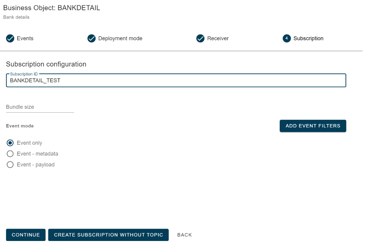 On the main subscription screen, an option called ADD EVENT FILTER is available if the payload has not been selected.