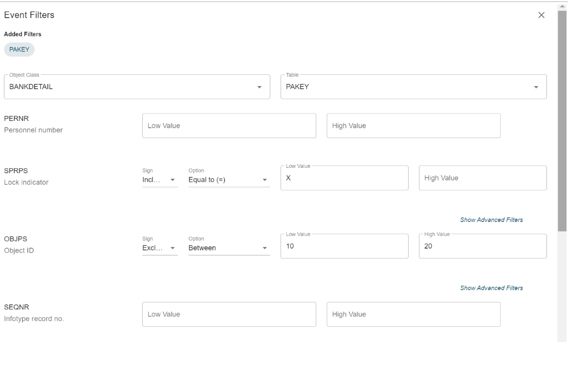 When you click on ADD EVENT FILTERS, the event filter screen will appear, showing the BO (BUSINESS OBJECT) as the Object Class. Table will show default table values if there are only key fields with references to a single table.