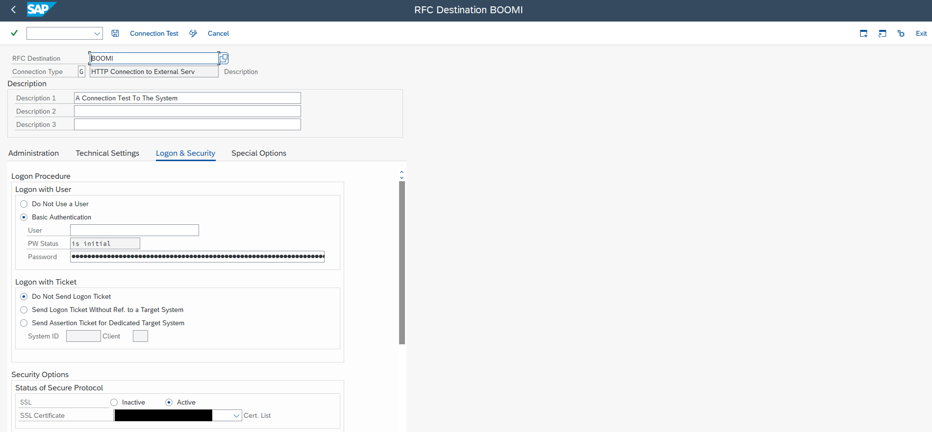 This guide outlines the process of establishing an RFC connection in SAP to link with a Boomi basic runtime using Basic authentication. Keep in mind that your configuration may vary if you opt for a different authentication method, employ a reverse proxy, or utilize a load balancer.