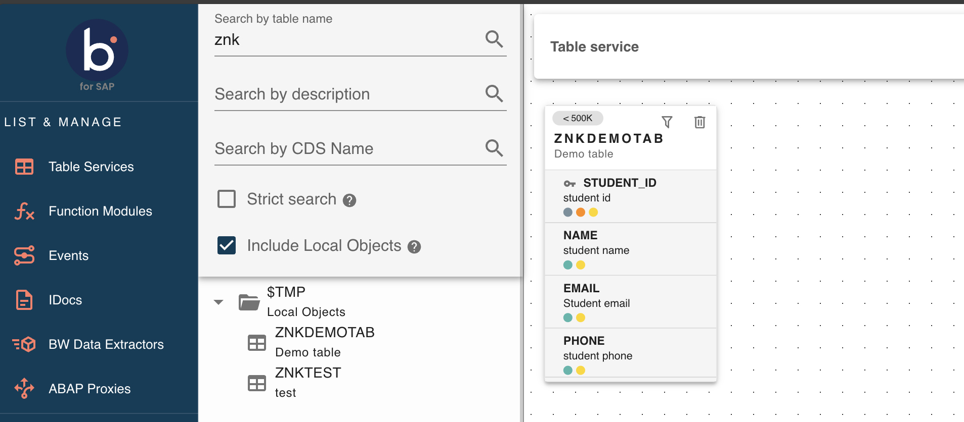 For a more specific search, select the Strict Search option. To include local objects in your search, select Include Local Objects; the $TMP folder will be revealed, containing local objects you can drag onto the canvas and use in the service. If you use any local objects in your service, the service mode will be restricted to Local on the Service Configuration screen.
