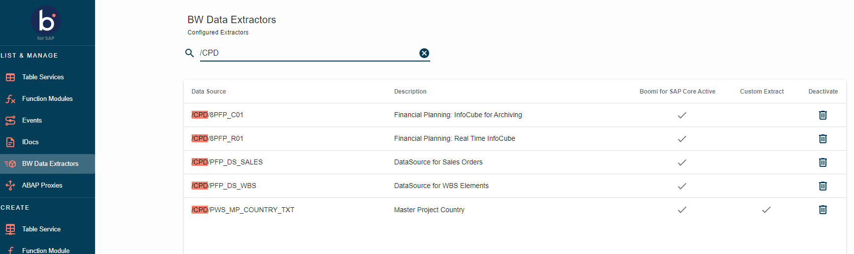 - To view the activated BW Data extractors, go to the homepage and click BW Data Extractors under the LIST menu on the left side.