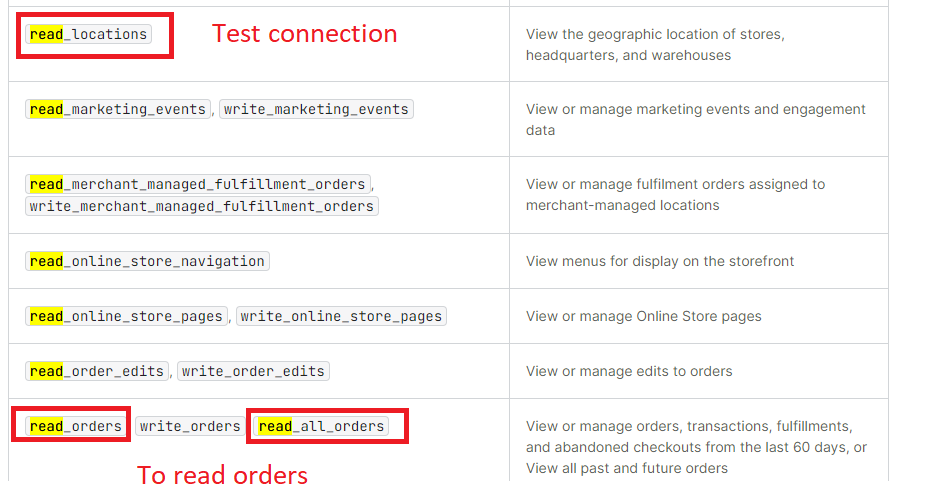 read_locations,read_orders,read_all_orders. - To extract data from the order transaction report, you need orders' scopes (as it also brings the transactions).