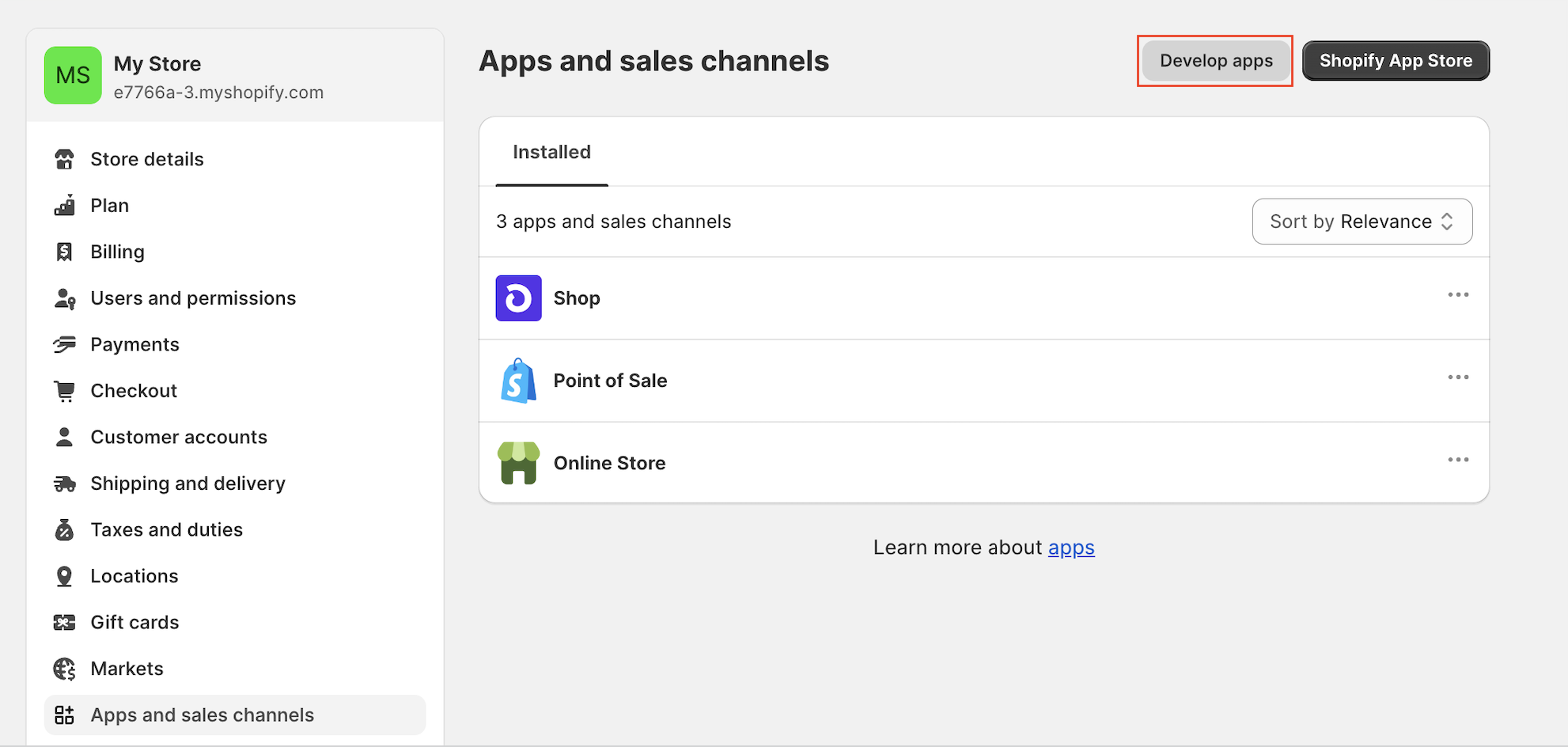 - From your Shopify Admin, click Settings > Apps and sales channels.
