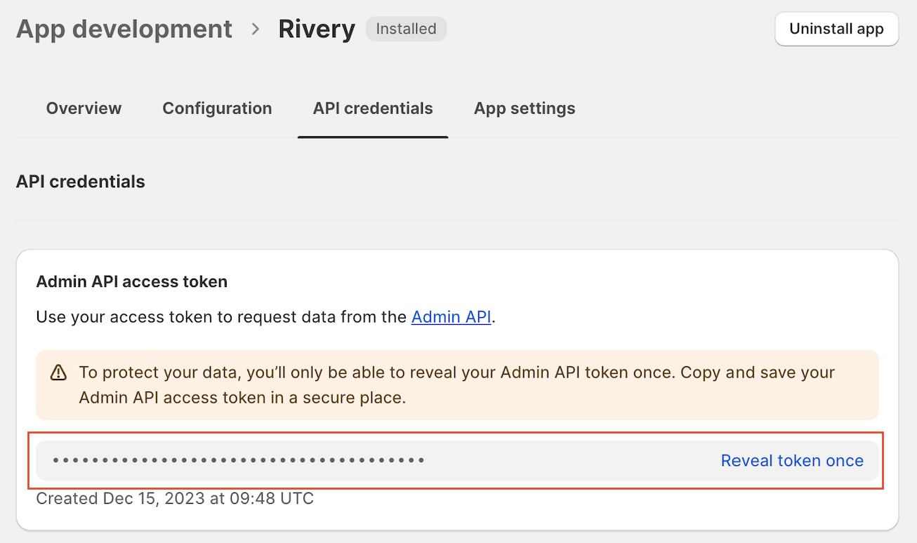 To activate custom app development, build your custom app, obtain the token, and shop name for establishing a connection with Data Integration. To learn more, refer to Shopify documentation.