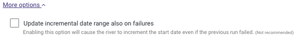 If you do not want this default setting, click More Options and select the checkbox to advance the start date even if the River run is unsuccessful (Not recommended).