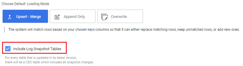To align the data and the metadata in the first run, Data Integration makes a complete snapshot (or migration ) of the chosen table(s) using the Overwrite loading mode. After the migration ends successfully, Data Integration takes the existing binlog records and makes an Upsert-merge __ to the target table(s), continuing to fetch new records from the log as they are created.
