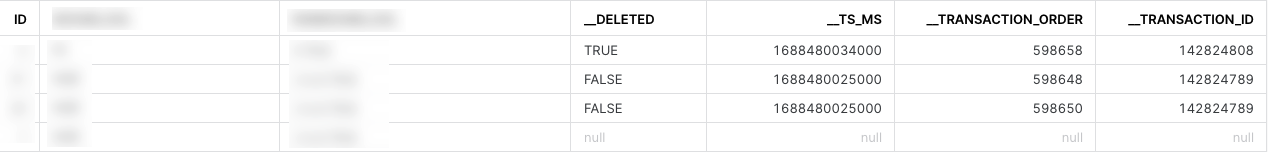 The TS_MS column, short for the TIMESTAMP Milliseconds column, is designed to convey integer values or null entries. Depending on the circumstance, the timestamps within this column are displayed in integer or null. This column serves the purpose of documenting the timing of changes when employing the CDC method.