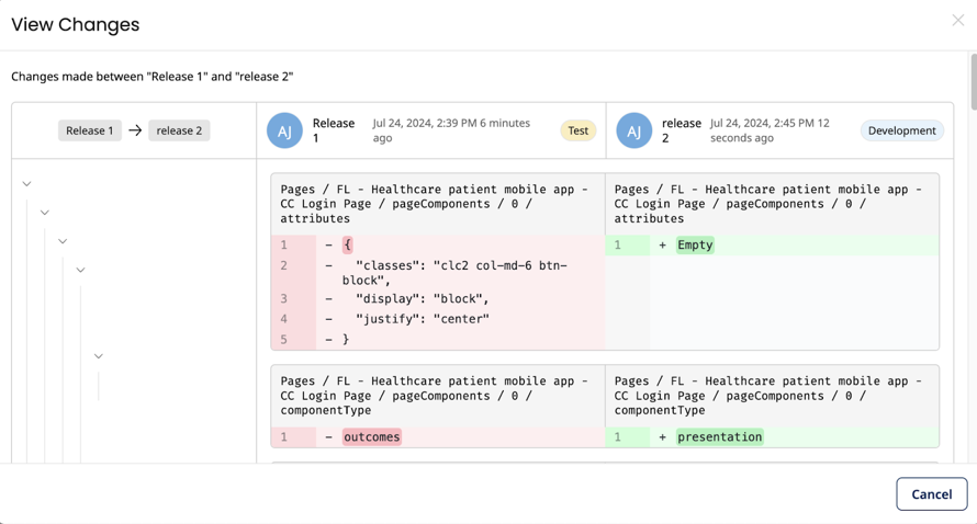 - Click View Changes to see a list of additions, deletions, and modifications that have occurred since the preceding version in the list.