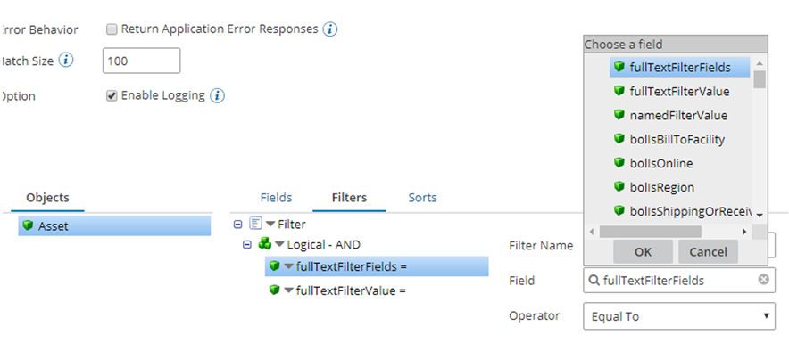 Use this search method when you specify “fullTextFilterFields” and “fullTextFilterValue” as parameters in Query operation Filters tab.
