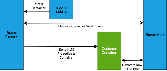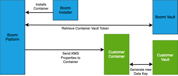 ConfigurationThe vault supporting KMS is fully managed by Boomi. No additional setup is required once the KMS feature is activated.The vault supporting KMS on the transit side is fully managed by Boomi, but the container side vault is fully managed by the customer. Additional configuration and setup is required to enable this functionality.
