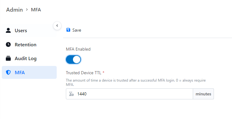 Trusted Device TTL - Refers to the duration for which a device remains trusted following a successful Multi-Factor Authentication (MFA) login. A value of 0 indicates that MFA will always be required for access.
