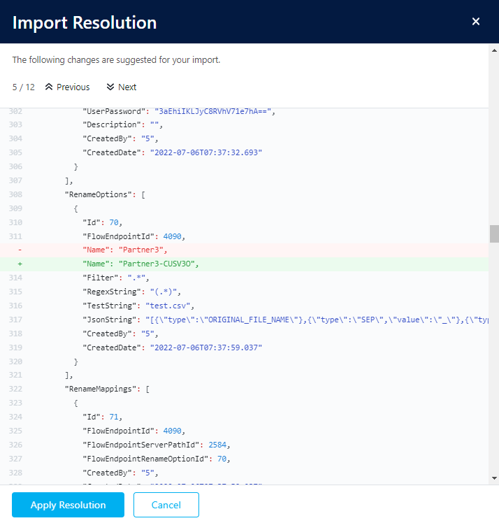 Clicking Resolve displays the imported JSON and highlight the issue and the automatic resolution.