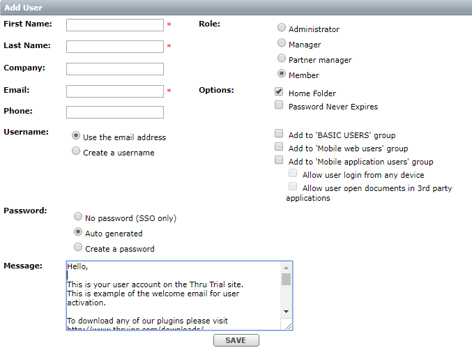 Enter a welcome message in the Message box that the new user can view when their account is activated.