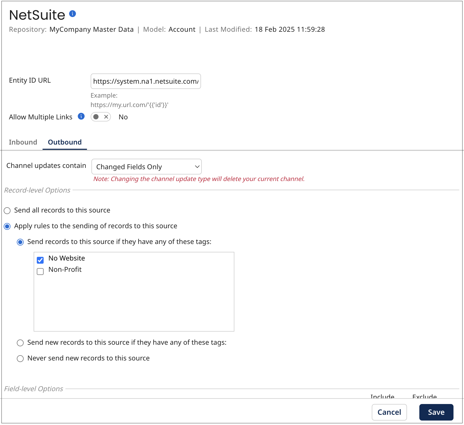 - Select Send records to this source if they have any of these tags if you have created tags in your model, you can use them to create this rule. The source receives updates if the record has the tag or tags specified. Read Managing Tags to learn more.