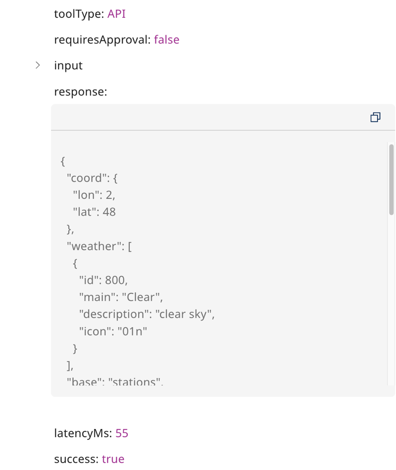 | latencyMs | Time taken by the tool to run the tool call (in milliseconds) |